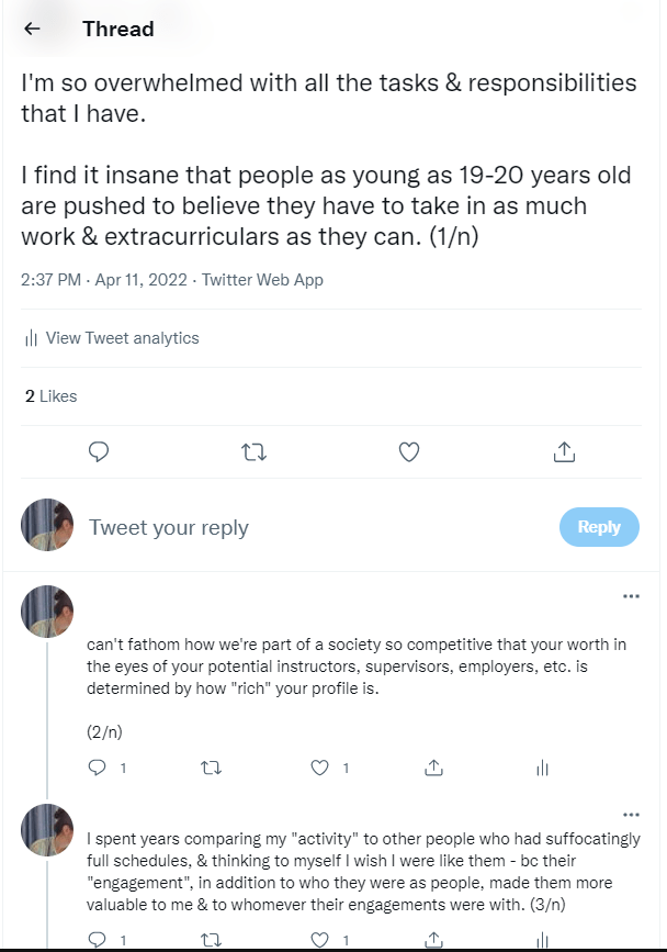 wait, no. before that. people glamorize exhaustion and exploitation. I remember a tweet I once saw and in which the author declared, “my eyes look like this for my grades to look like this.”